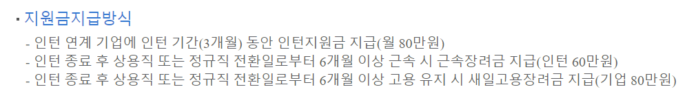 - 지원금 지급방식: 인턴기간 3개월 동안 월 80만 원을 받게 되고 인턴 종료 후 사용직, 정규직 전환일부터 6개월 이상 근속 시에 인턴 장려금 60만 원, 기업 고용 유지 시 기업 장려금 80만 원을 받게 됩니다.