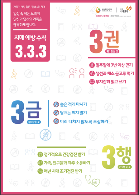 <출처>질병관리본부, 보건복지부지정 노인성치매임상연구센터, 임상연구지원센터.치매예방을 위한 인지건강수칙[책자, 팸플릿]. 보건복지가족부. 2009.